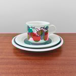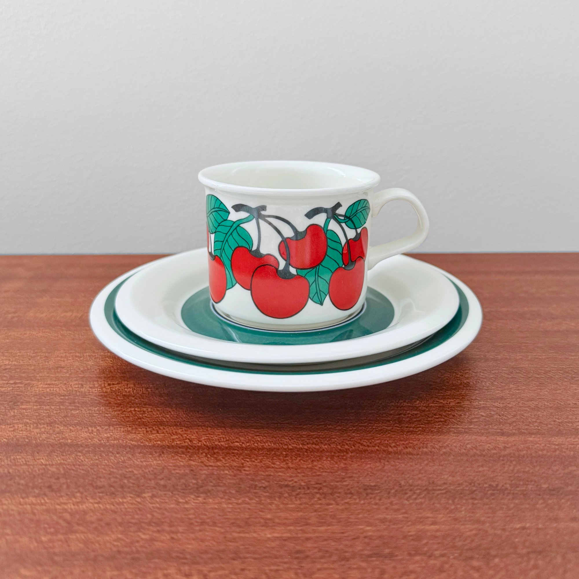 Rare vintage Arabia Finland Kirsikka coffee cup trio set with cake plate. Designed by Inkeri Leivo, Finland 1970s. In excellent vintage condition.