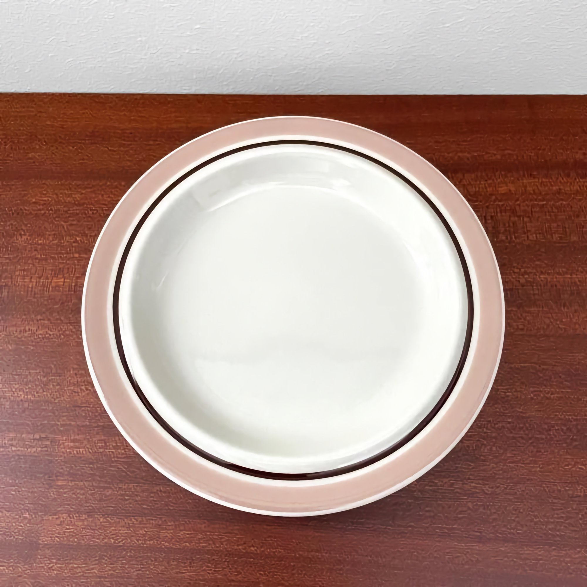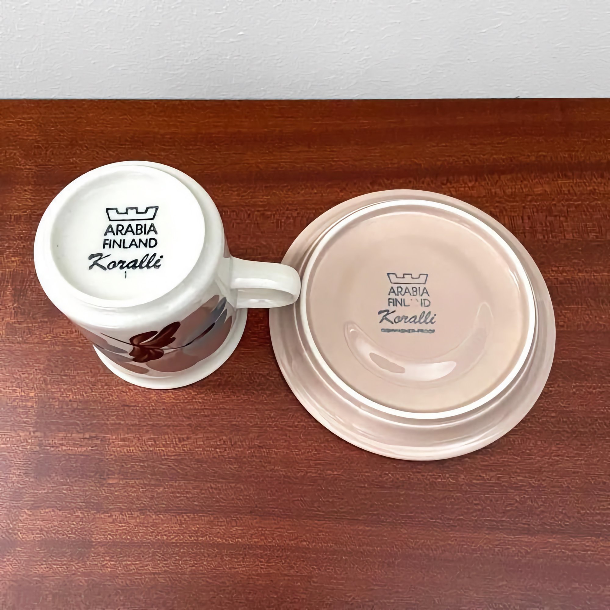 Rare vintage Arabia Finland Koralli coffee cup trio set with cake plate. Designed by Raija Uosikkinen, Finland 1980s. In excellent vintage condition.