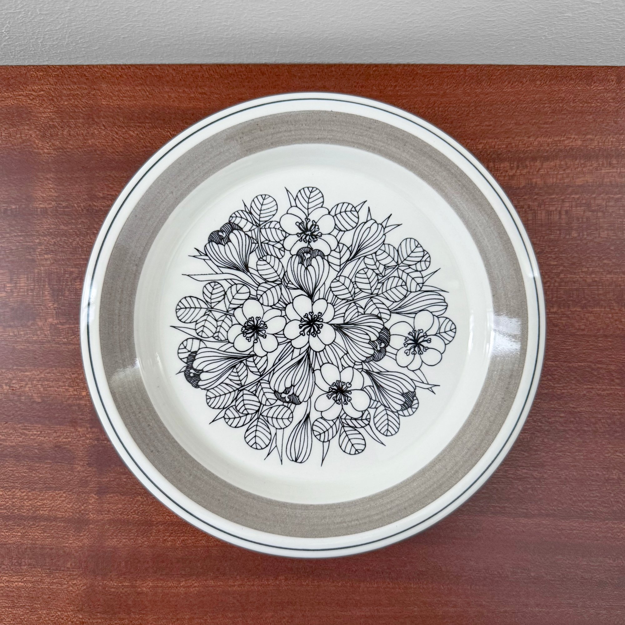 Rare vintage Arabia Finland Krokus black and white grey rim cake plate. Produced for limited period of time from 1978-79. Designed by Esteri Tomula, Finland 1970s. In excellent vintage condition.