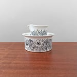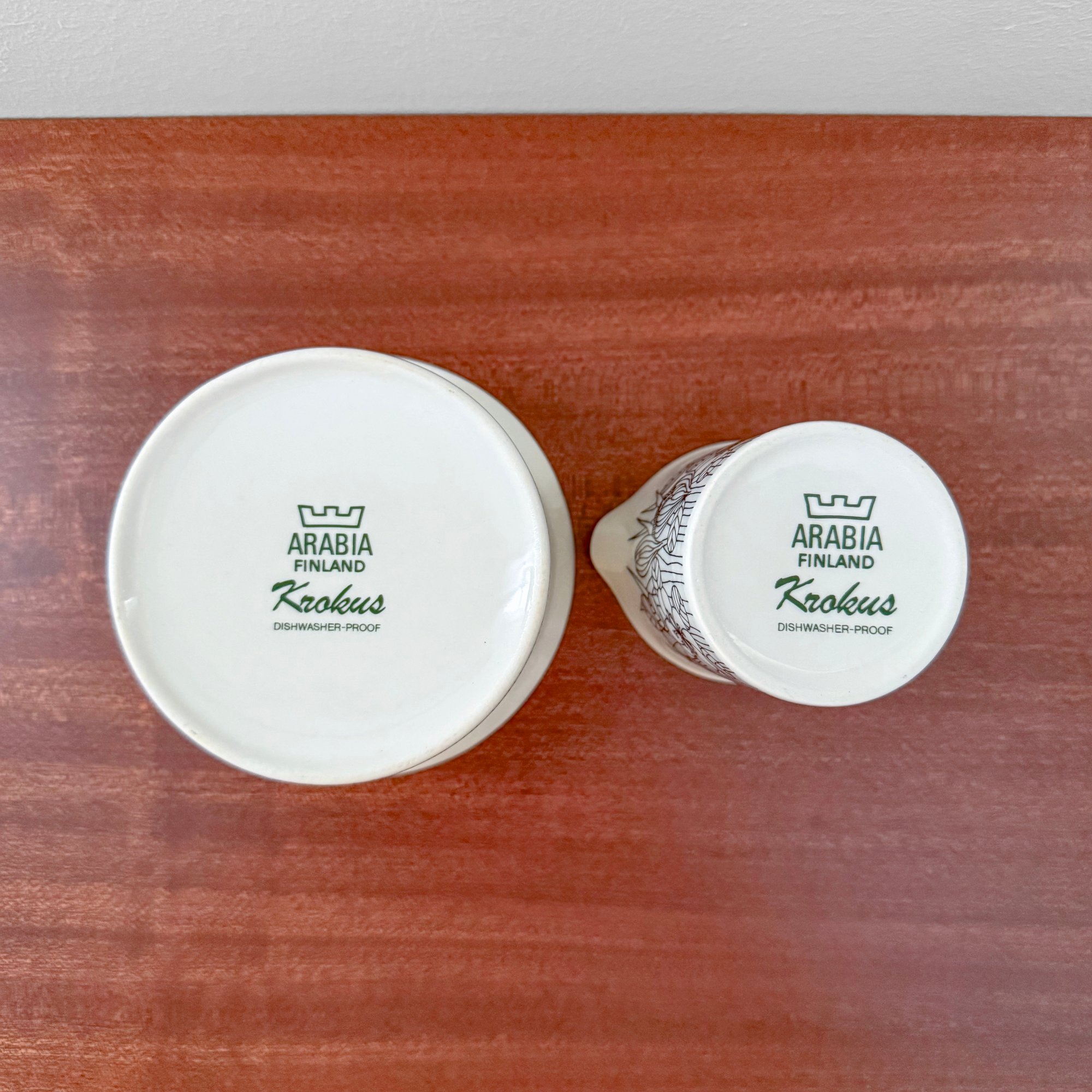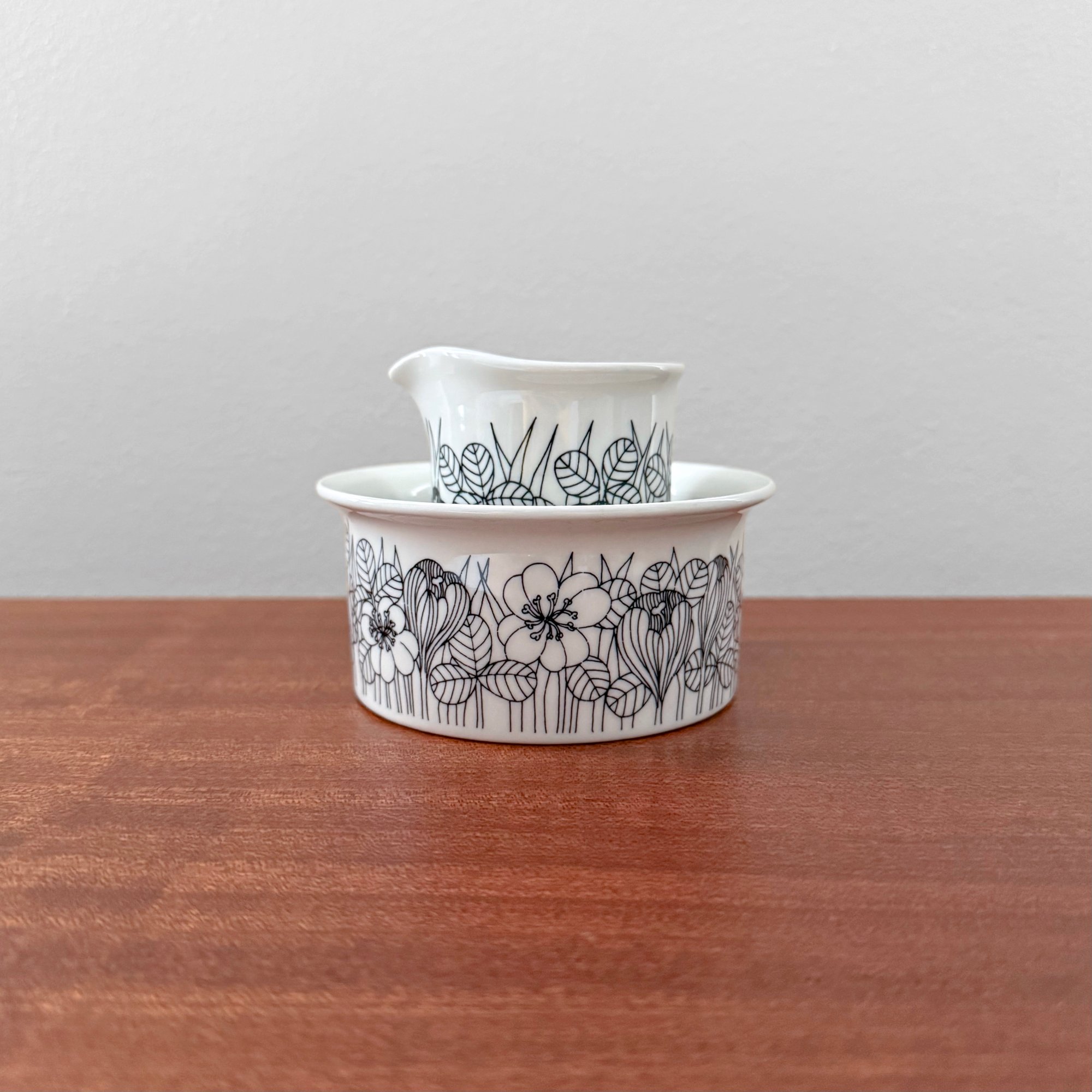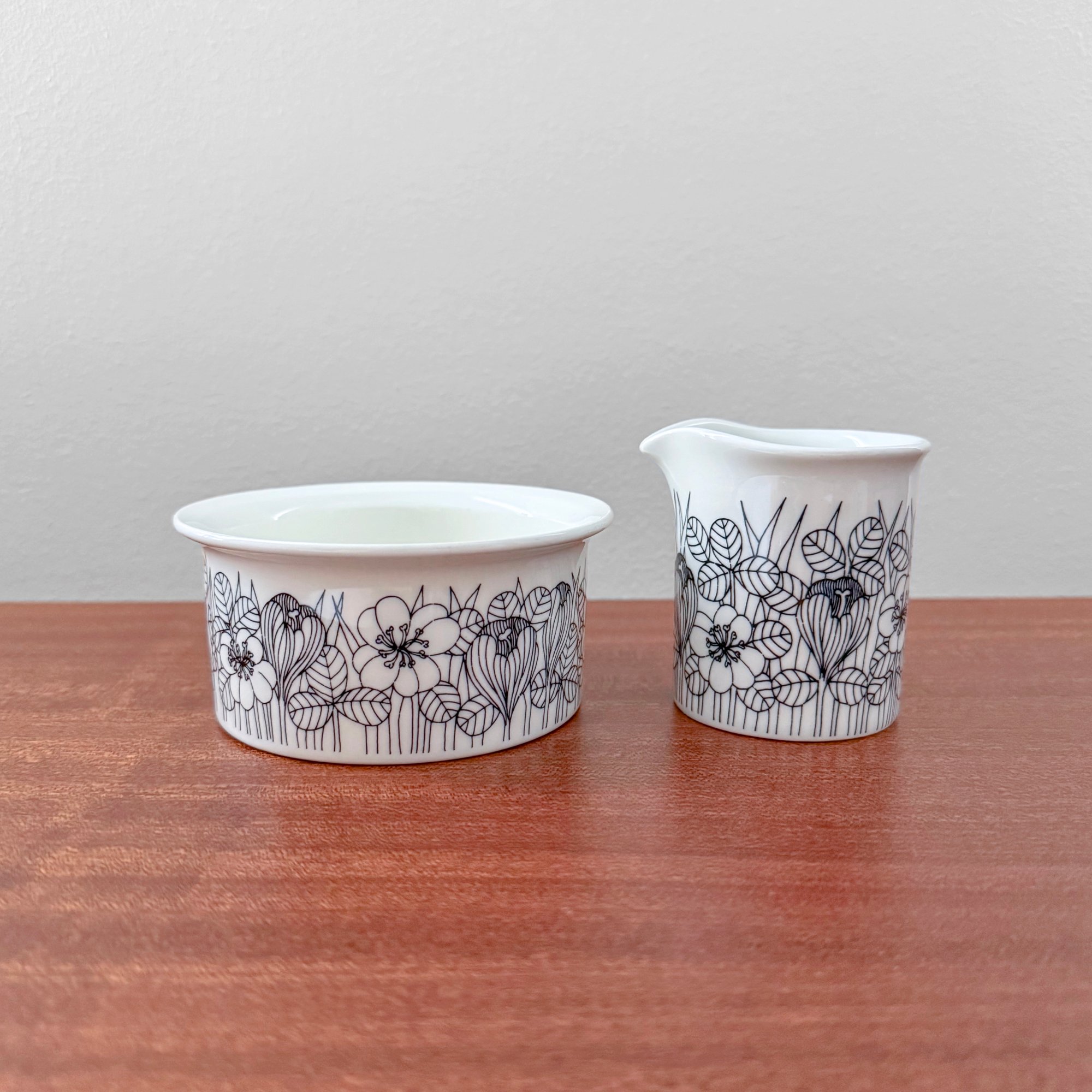 Rare vintage Arabia Finland Krokus black and white sugar bowl and creamer. Produced for limited period of time from 1978-79. Designed by Esteri Tomula, Finland 1970s. In excellent vintage condition.