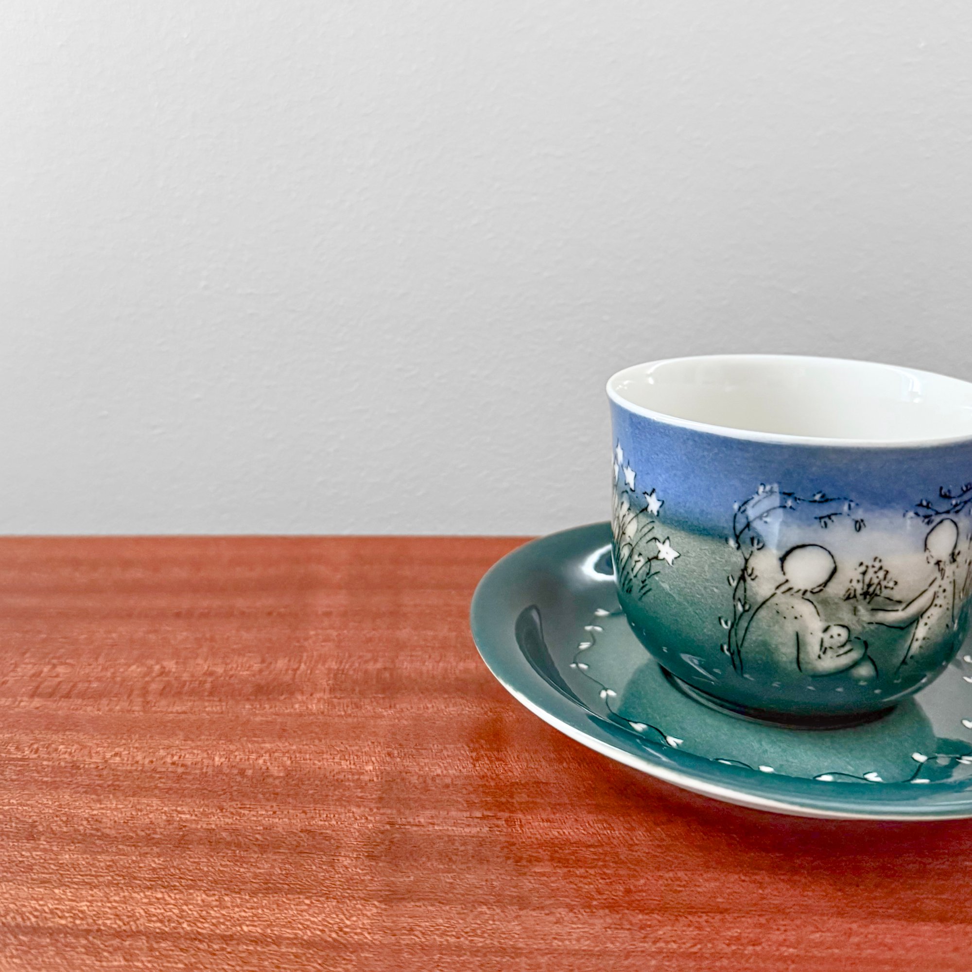 Dimensions: Cup diameter 9 cm, height 7.5 cm. Saucer diameter 16 cm.