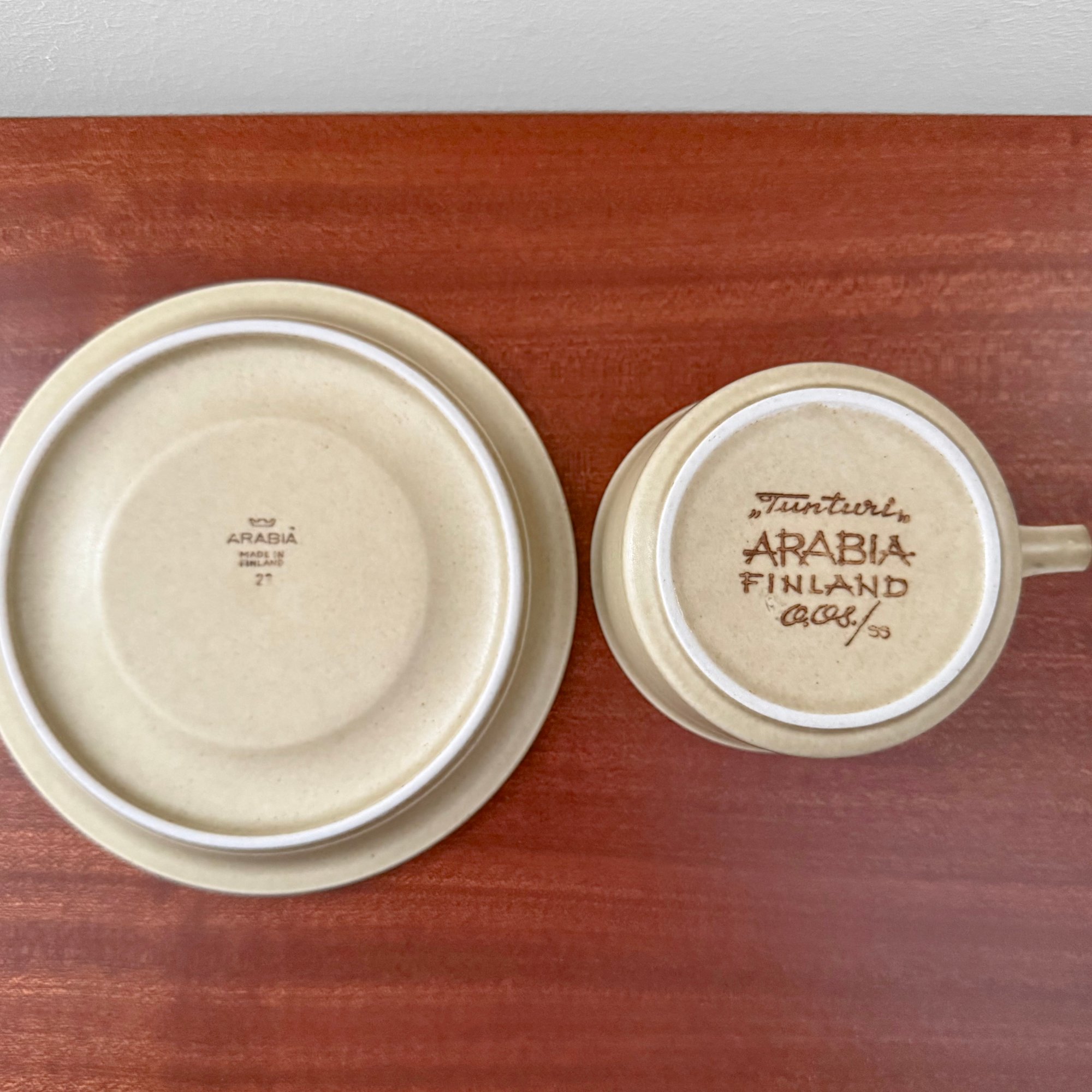 Vintage Arabia Finland Tunturi tea cup trio set with cake plate. Designed by Olga Osol, Finland 1960s. In excellent vintage condition.