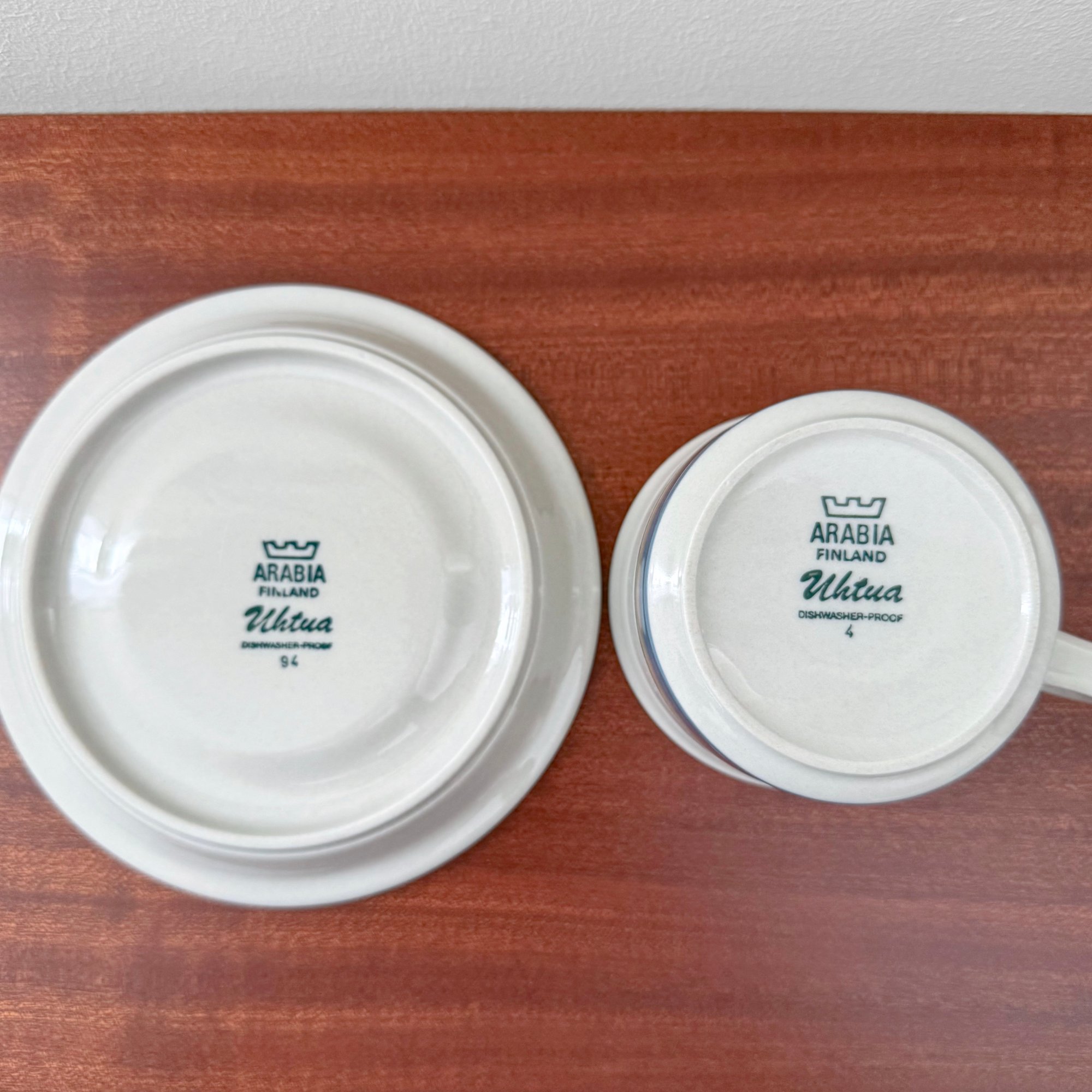 Vintage Arabia Finland Uhtua tea cup and saucer. Designed by Inkeri Leivo, Finland 1980s. In good vintage condition with signs of use.