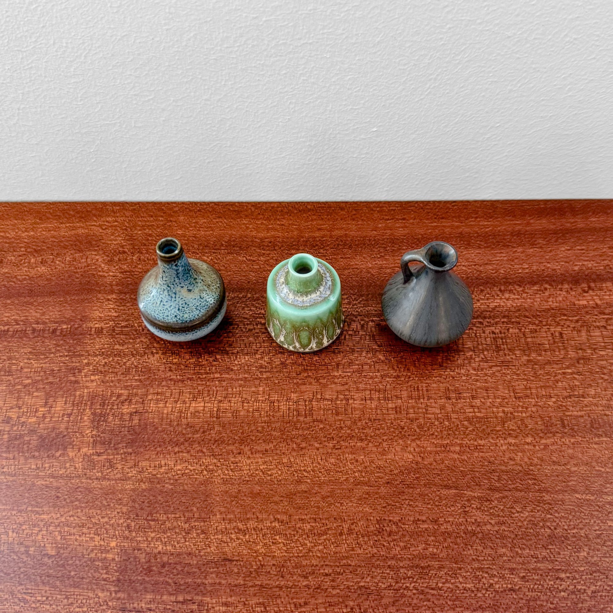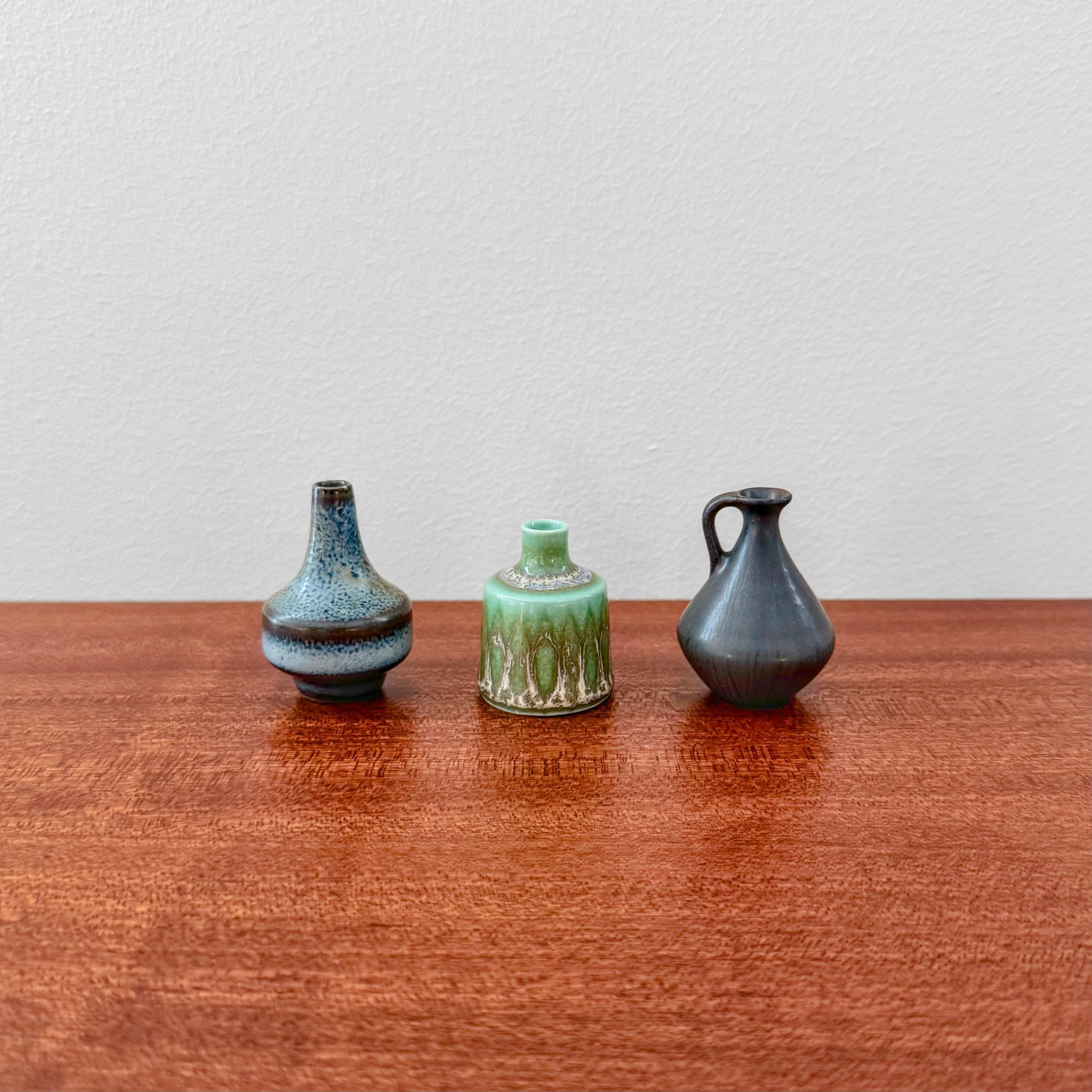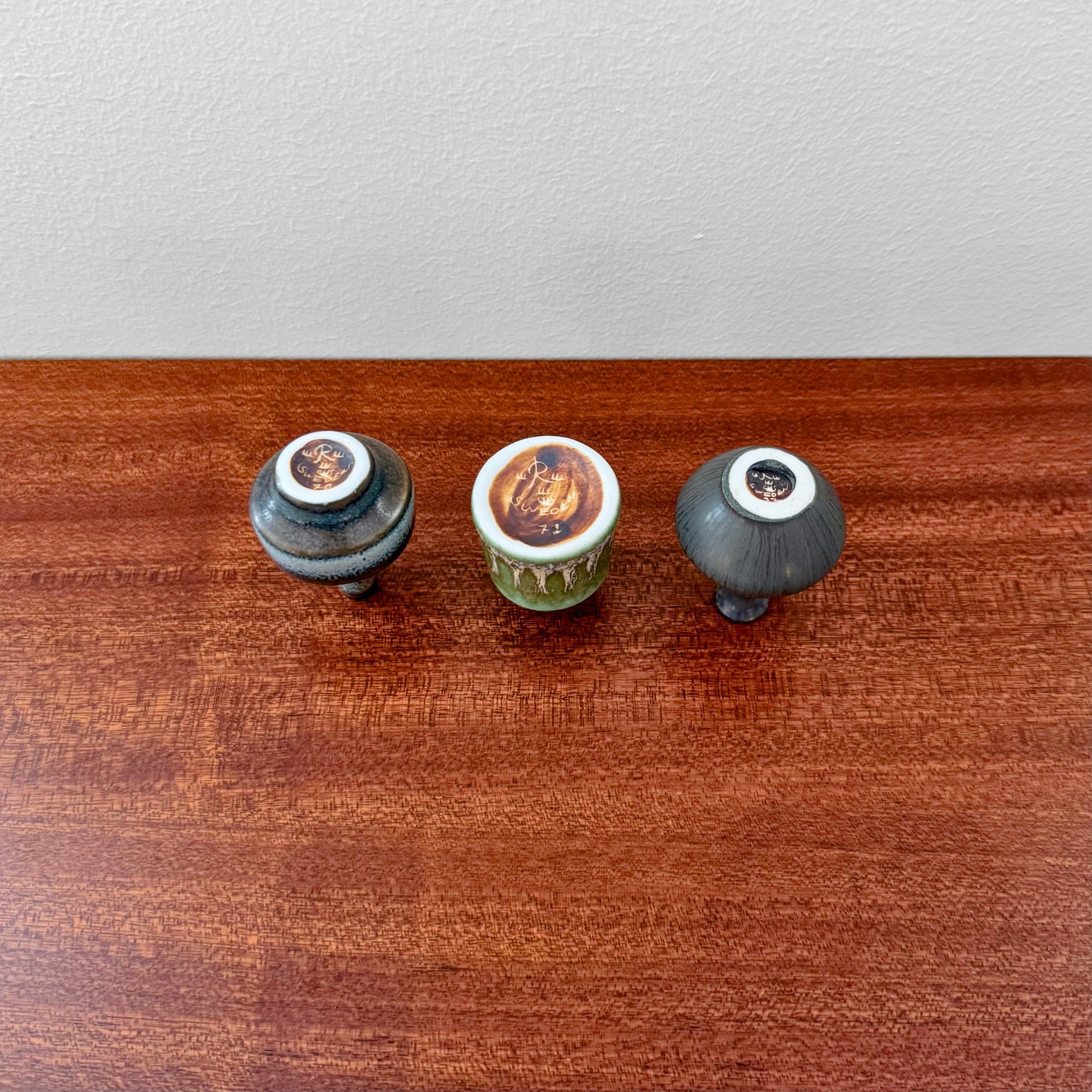 Set of rare vintage Rörstrand stoneware miniatures in assorted glazes. Designed by Carl-Harry Stålhane, Sweden 1950s. In excellent vintage condition, underside marked "R (three crowns) CHS Sweden" with model number.