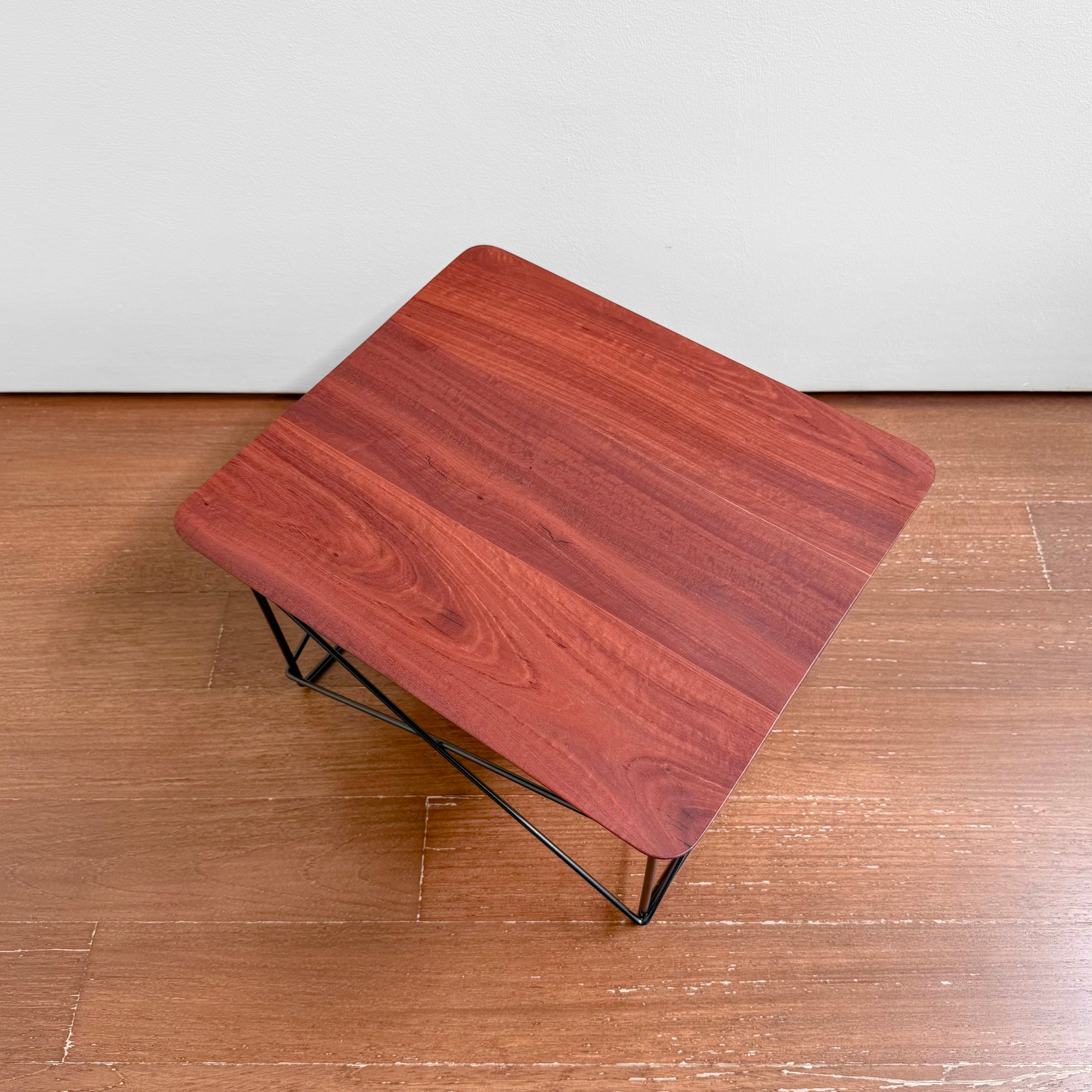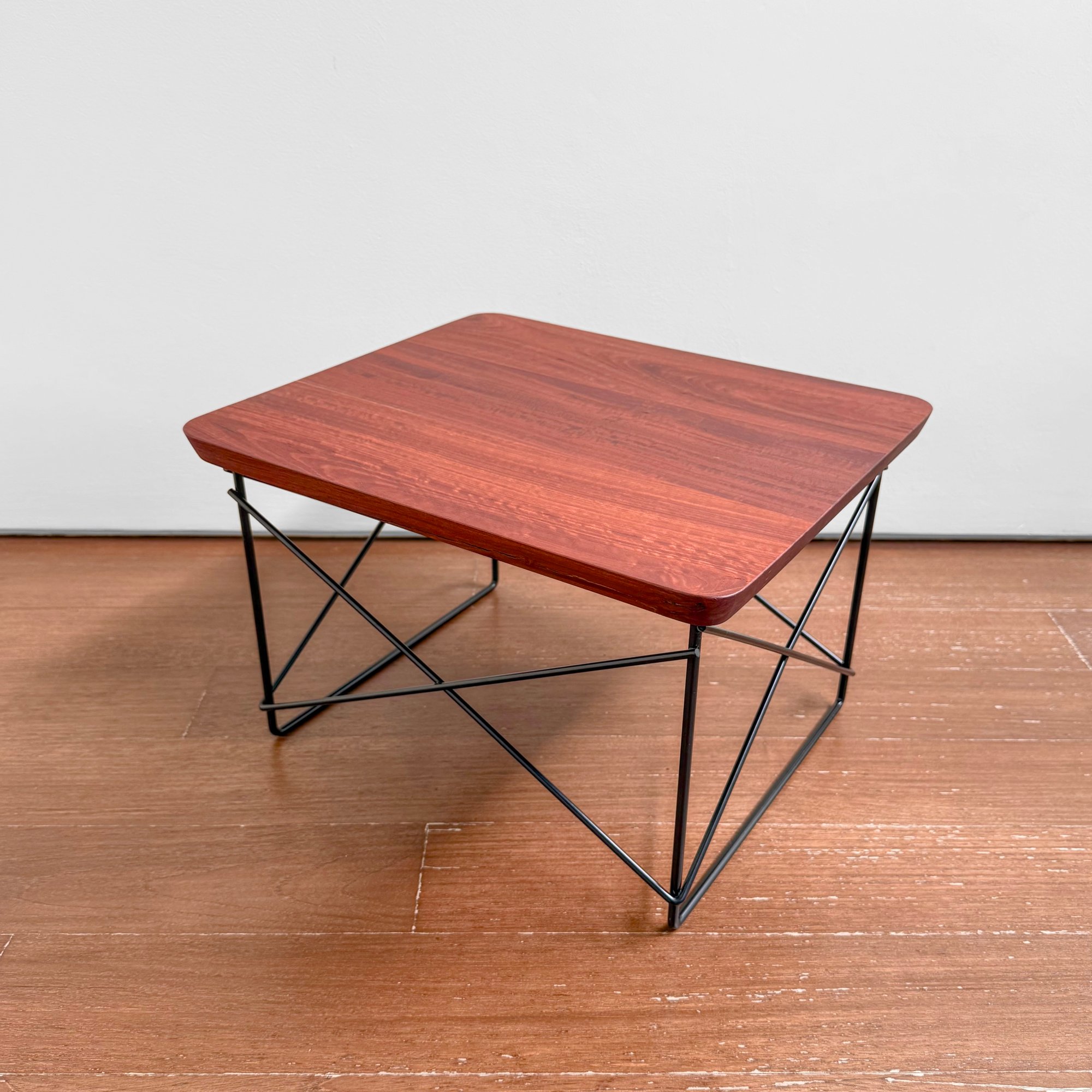 Eames LTR table with solid eucalyptus top and black powder coated wire base. In excellent used condition, table top has naturally occurring knots and cracks. Limited edition release by the Eames Foundation in partnership with Herman Miller and Vitra in 2019 to commemorate the 70th anniversary of the Eames House, with tops made of eucalyptus wood harvested from the Eames House property as part of ongoing conservation efforts.
