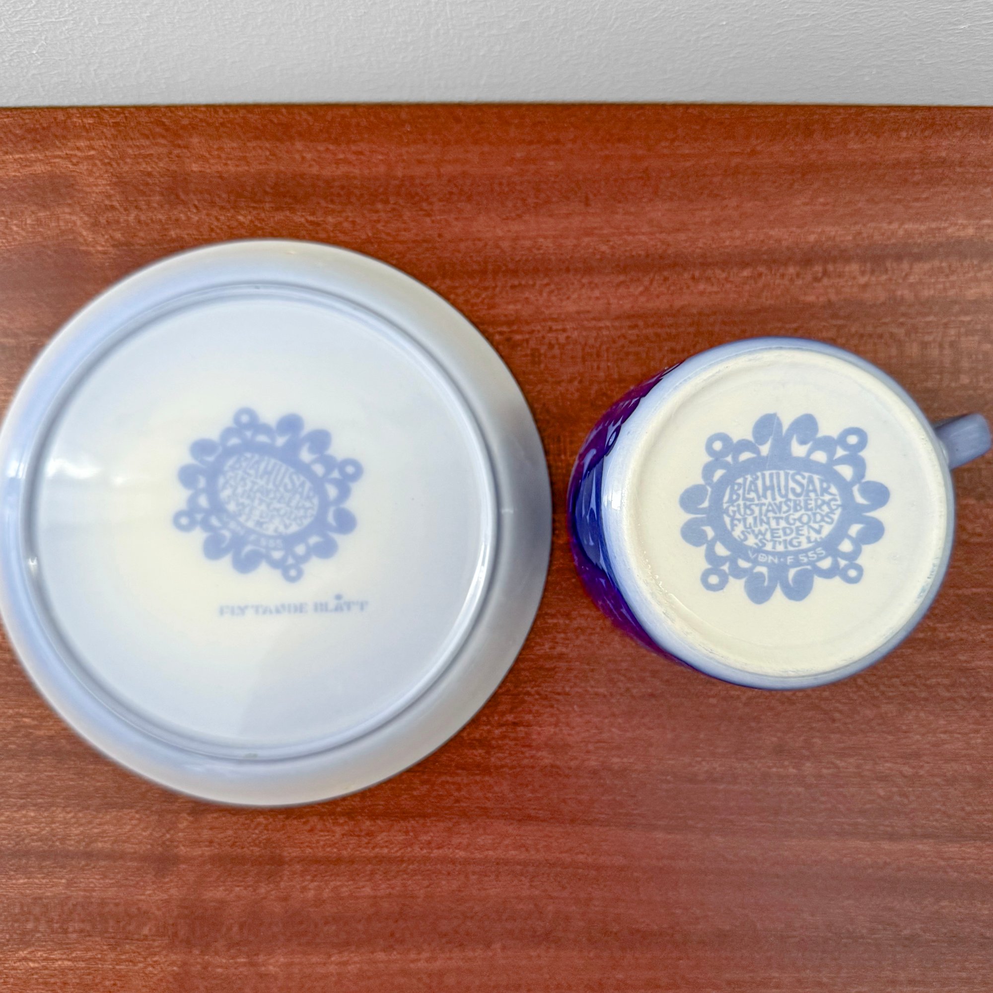 Vintage Gustavsberg Blå Husar tea cup trio set with cake plate. Designed by Stig Lindberg, Sweden 1960s. In very good vintage condition with signs of use.