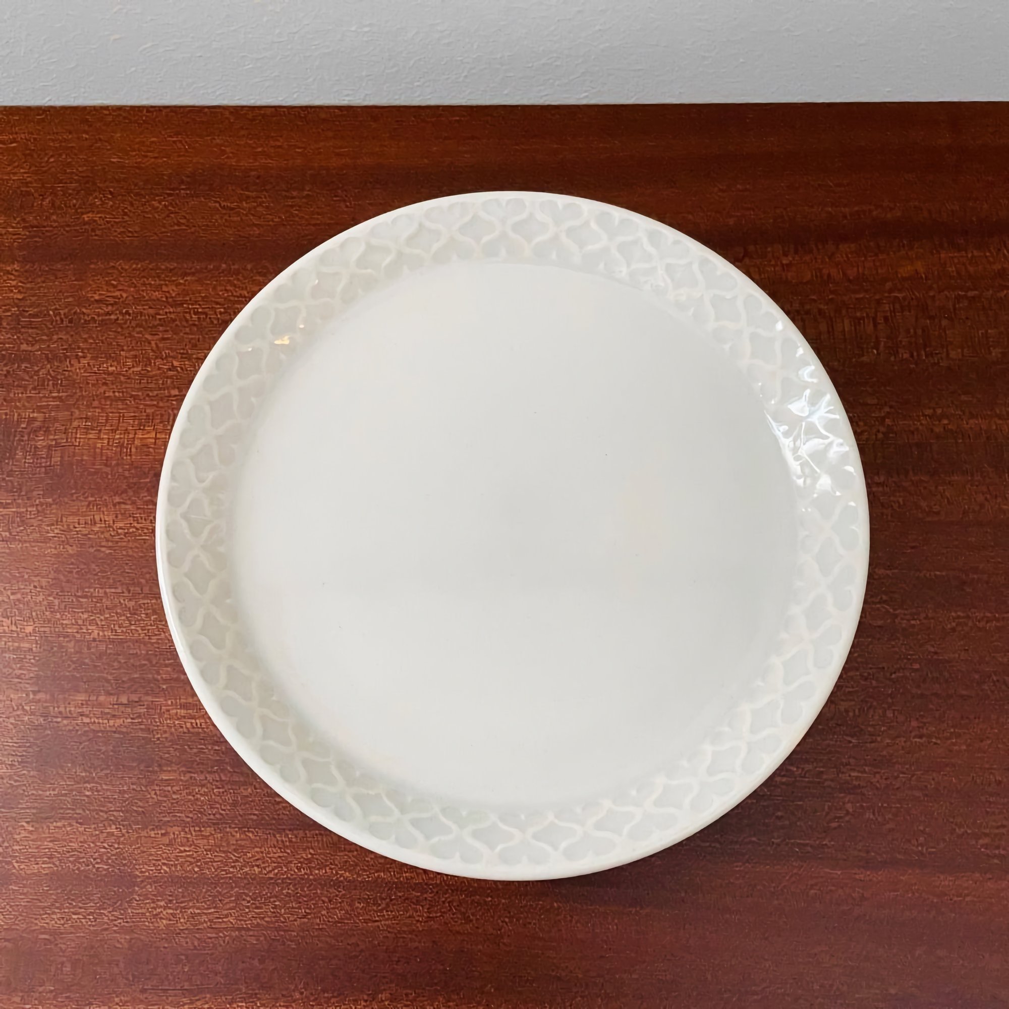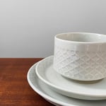Super rare vintage Bing & Grøndahl Cordial Palet off-white tea cup trio set with cake plate. Designed by Jens Harald Quistgaard, Denmark 1960s. In excellent vintage condition, only saucer has crazing.
