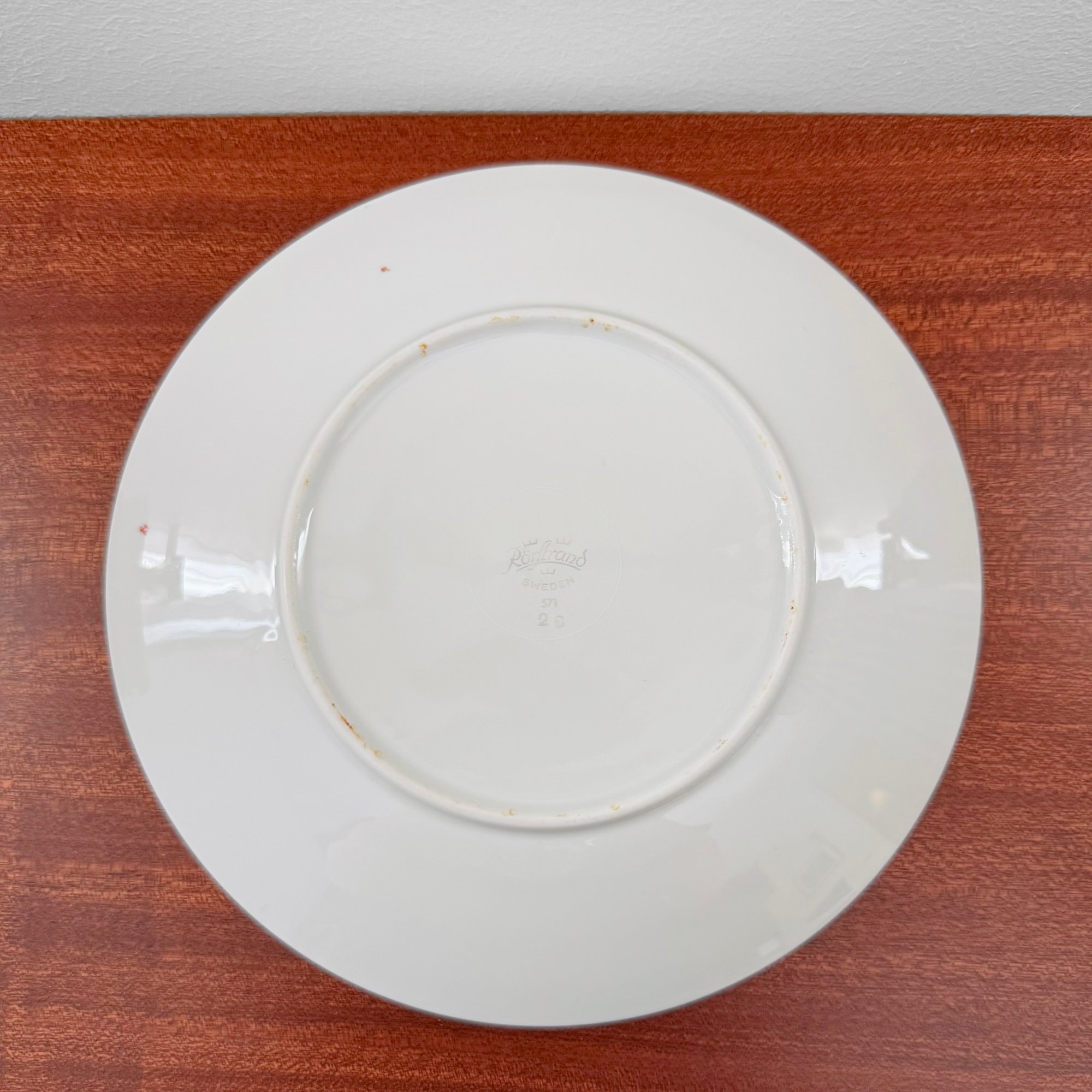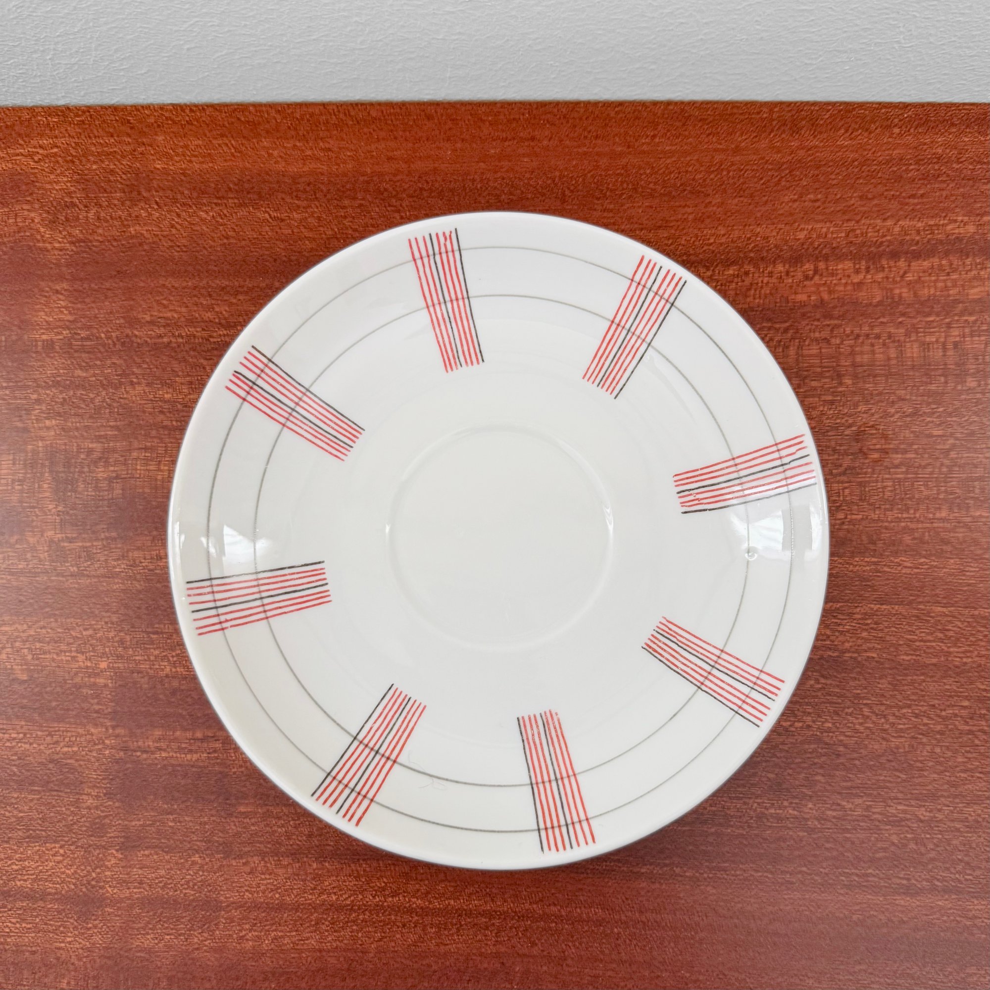 Vintage Rörstrand tea cup trio set with cake plate. Decorated with red and black stripes. Unknown designer, produced in Sweden. In very good vintage condition with signs of use.
